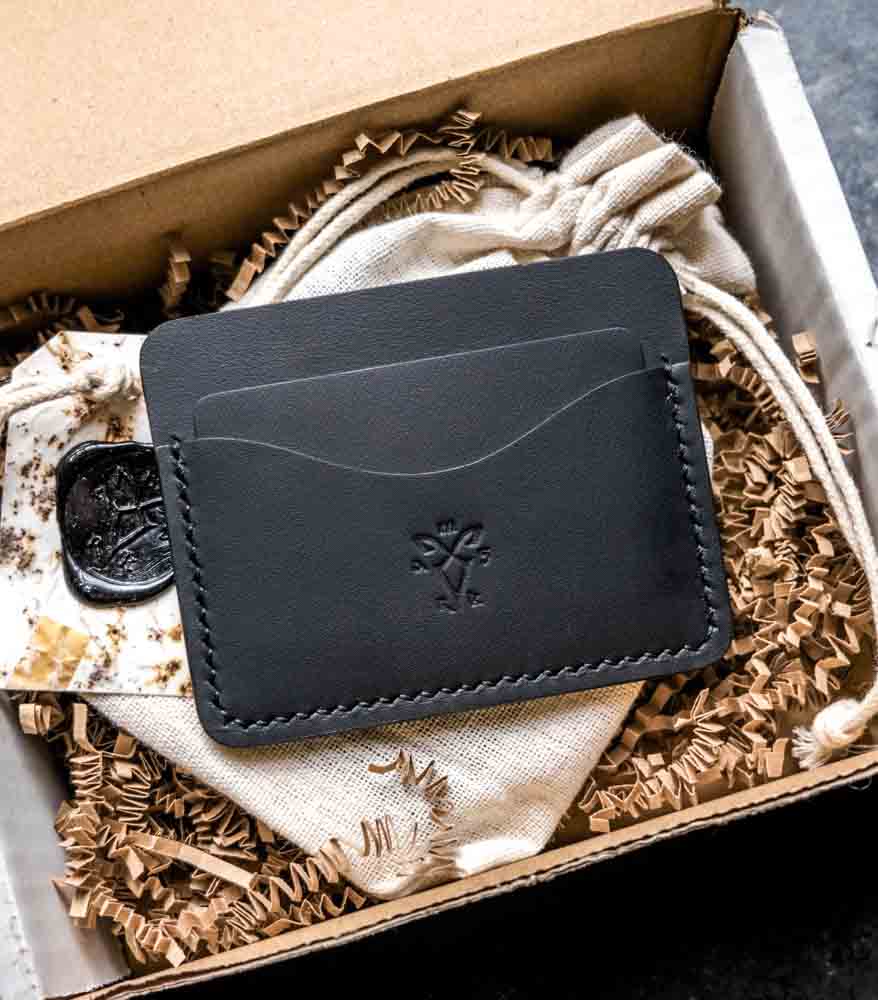 Portofel slim piele naturală neagră cu sigiliu ceară și ștanță logo marksatelier