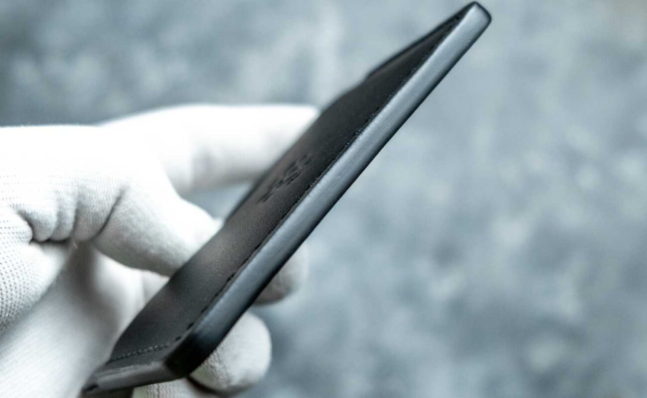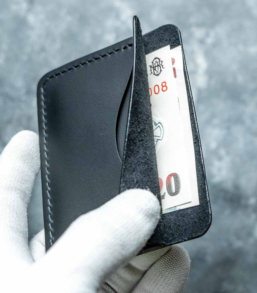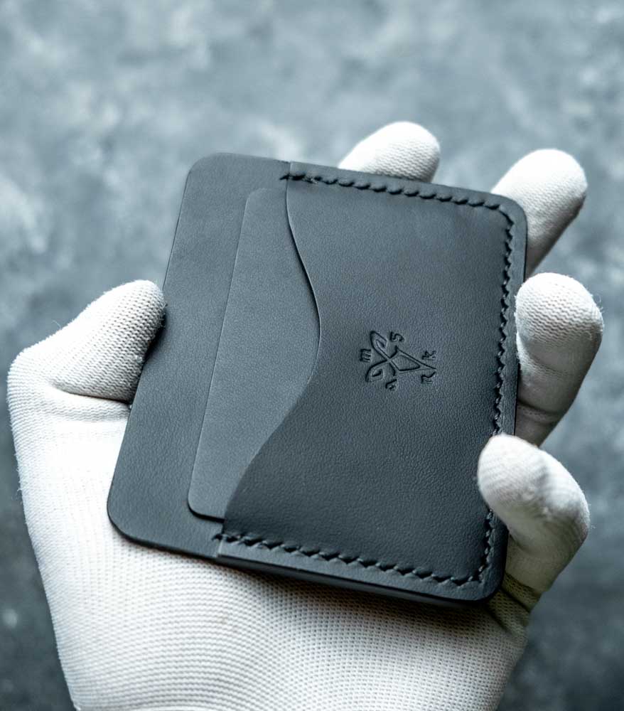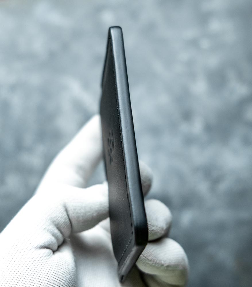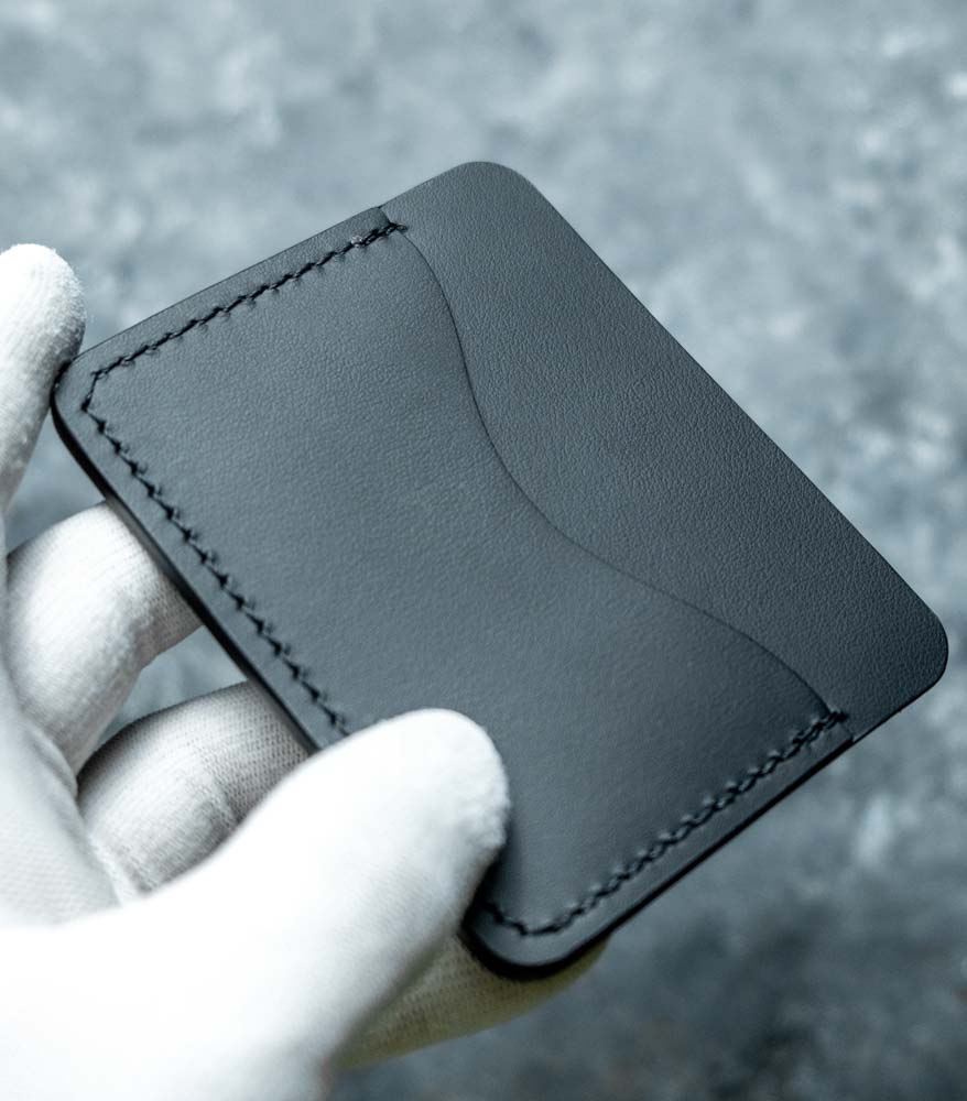 Cusătura este executată French Style, cu ață de polyester neagră, rezistentă la frecare și la umiditate. Pielea este premium – dintr-o categorie superioară a pieilor naturale – tăbăcită mineral pentru flexibilitate și stabilitate cromatică în timp. Marginile sunt finisate manual cu vopsea pe bază de apă, în mai multe straturi succesive, până capătă un finisaj neted, mat. Fiecare etapă – croit piesele după tipar, lipit, cusut, finisat canturi – e făcută manual în atelier. Nu e producție de serie, nu e import rebrand-uit. Este un portofel pe care îl ții 10-15 ani, nu 10-15 luni.