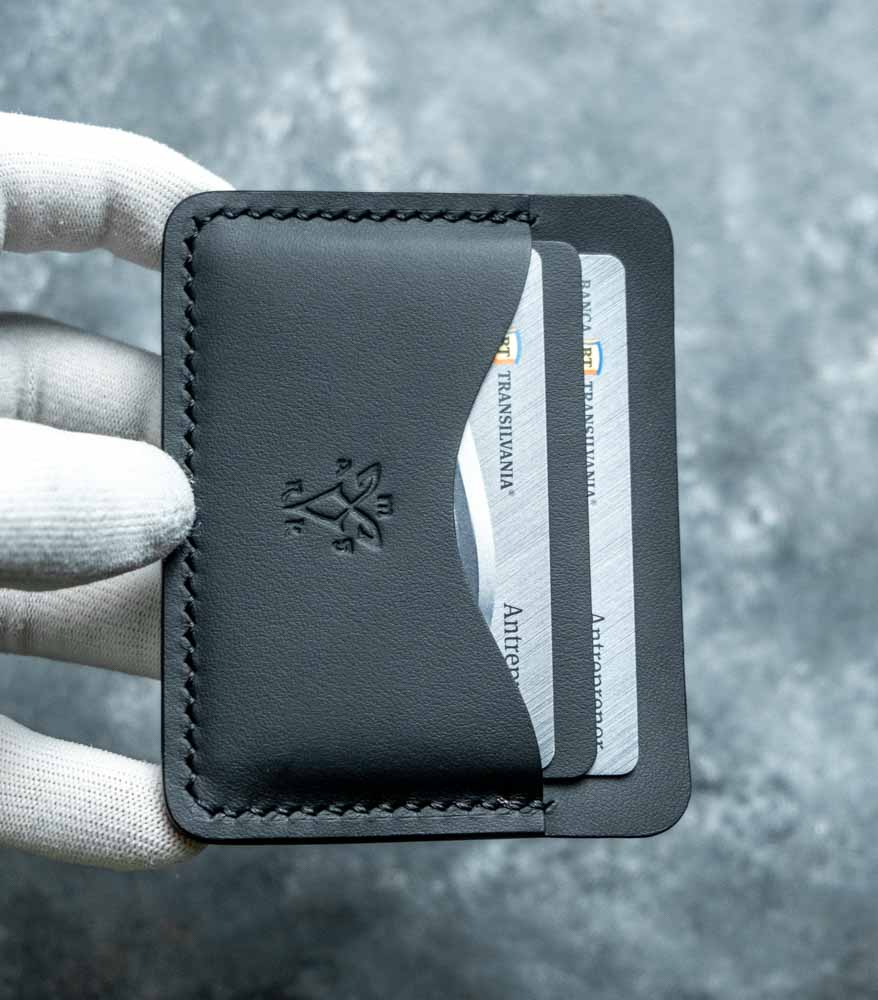 Portofelul slim Black Edition a fost croit pentru cumpărătorul care nu vrea să aleagă între portofelul vechi voluminos și un simplu card holder fără personalitate. Are 10.5 x 8.2 cm, exact cât să cuprindă buletinul nou tip card (CEI), între 2 și 6 carduri și câteva bancnote îndoite, fără să umfle buzunarul de la pantalon. Față de portcardurile industriale din piele ecologică care apar pe marketplace-uri la 40-60 lei, această piesă este lucrată în atelierul nostru din România, din piele naturală, croită și asamblată manual. Diferența nu e doar de calitate, e de durată.